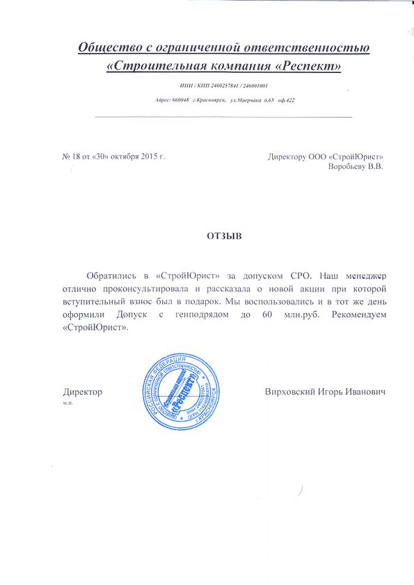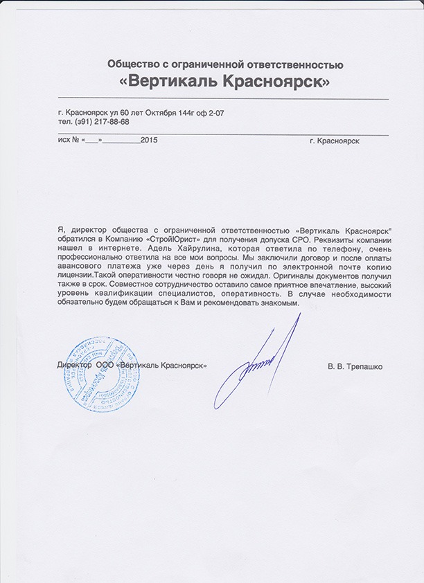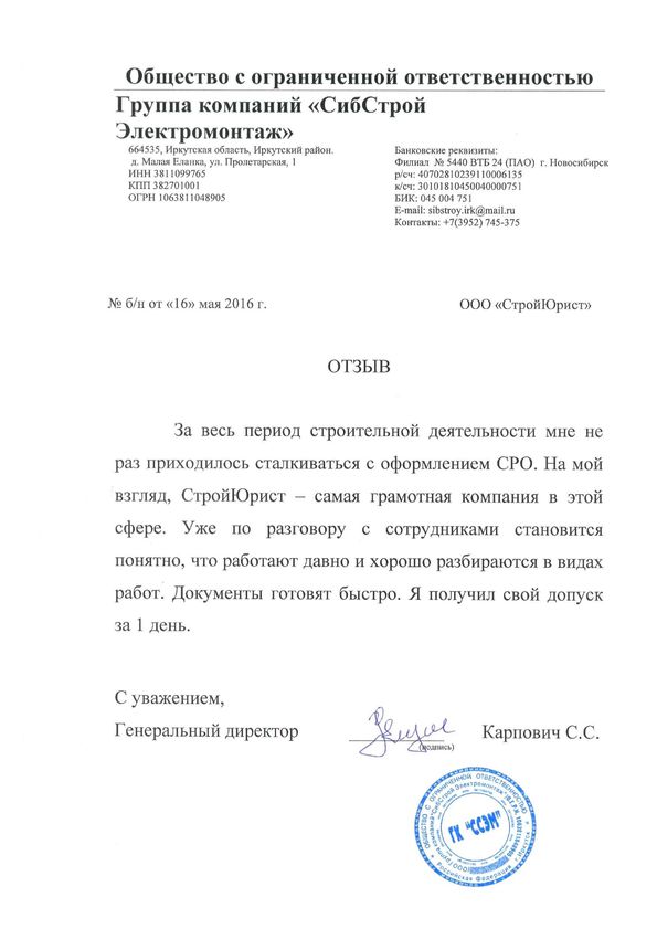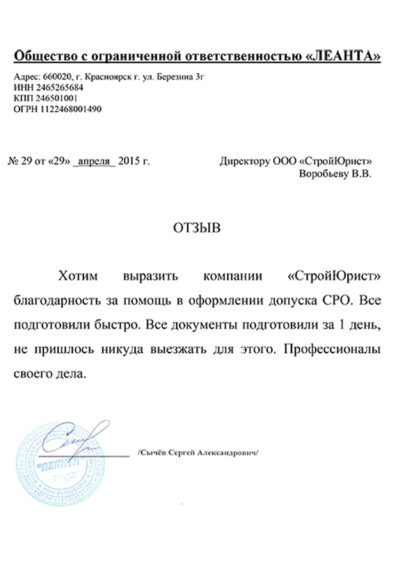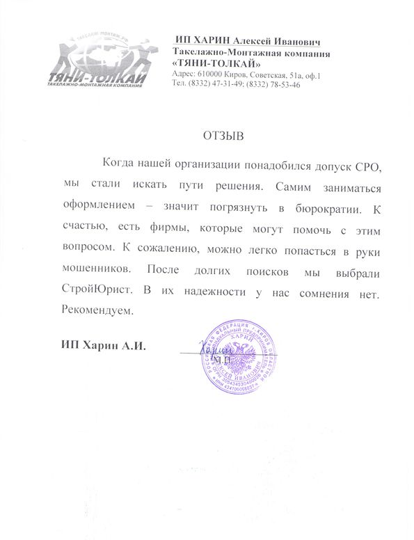 Отзывы клиентов "СтройЮрист" по вступлению в СРО в Тольятти