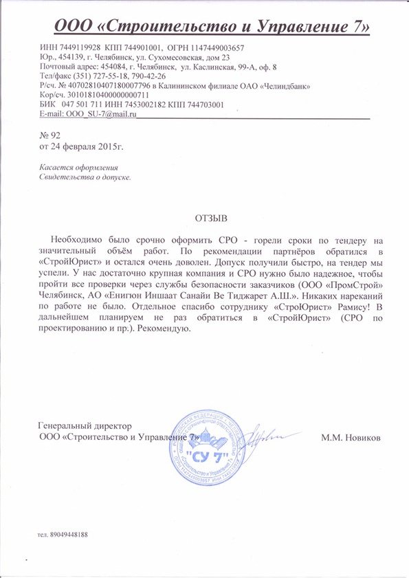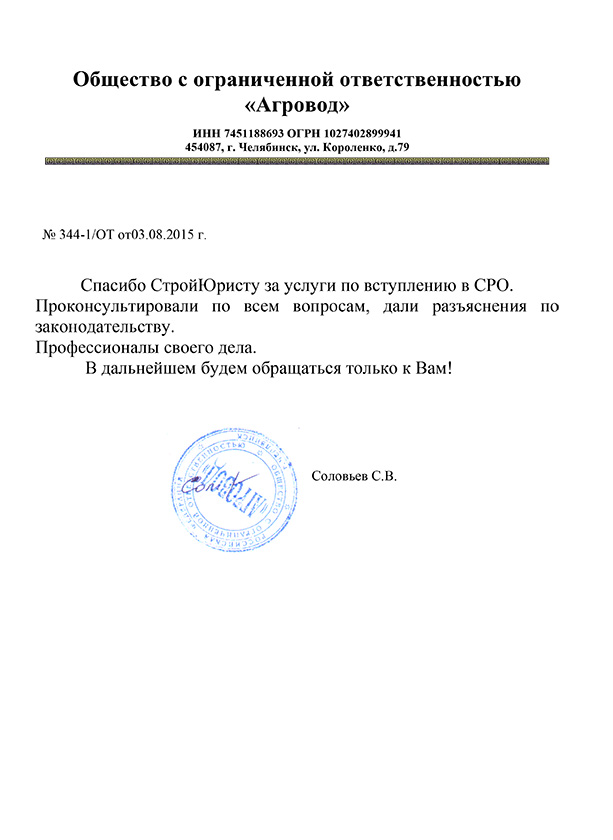 Отзывы клиентов "СтройЮрист" по вступлению в СРО в Тольятти