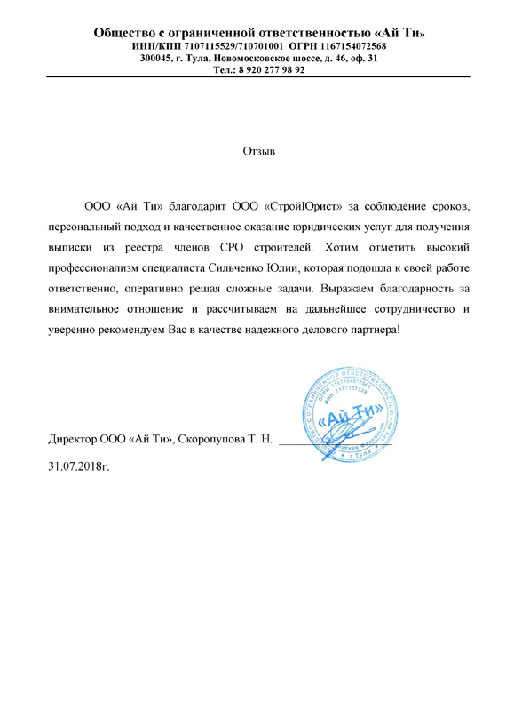 Отзывы клиентов "СтройЮрист" по вступлению в СРО в Тольятти